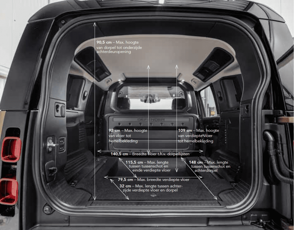 Defender 90 Hard Top’un yük alanı kapasitesi verileri de dikkat çekici. 947 mm yükseklik, 1326 mm genişlik, 1030 mm ilk sıra arkası uzunluk, 1115 lt ilk sıra arkası maksimum kuru yük alanı kapasitesi ve 1355 lt ilk sıra arkası maksimum ıslak yük alanı kapasitesi verilerine sahip.